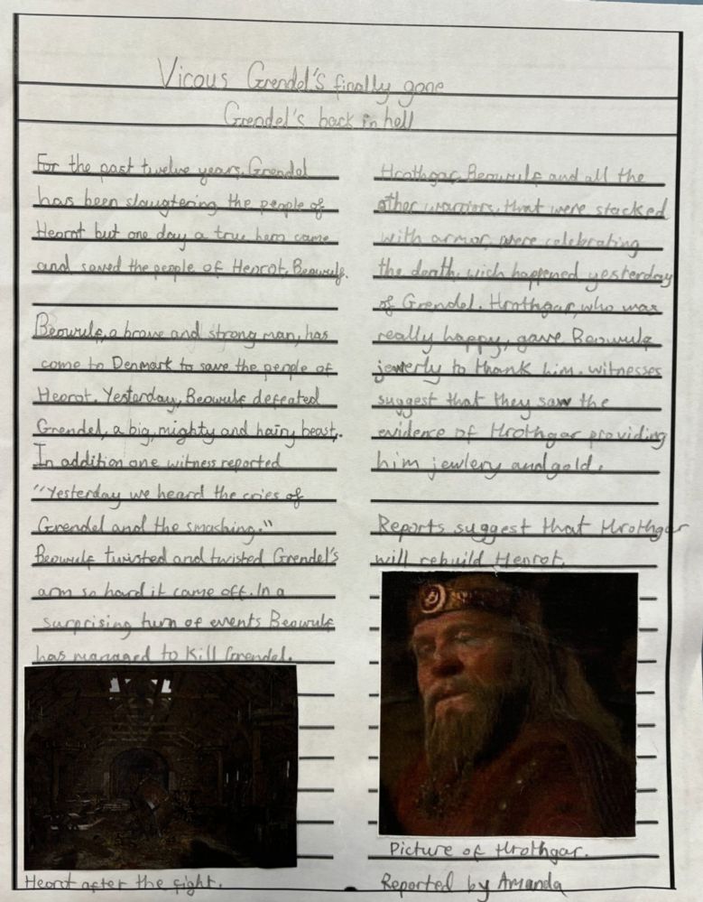 Building on this, pupils planned, drafted, and published their own newspaper reports recounting Beowulf’s thrilling defeat of the monster Grendel. This unit helped children practise key writing skills such as using formal language, organising information into clear paragraphs, and adding exciting quotes and headlines to engage the reader.